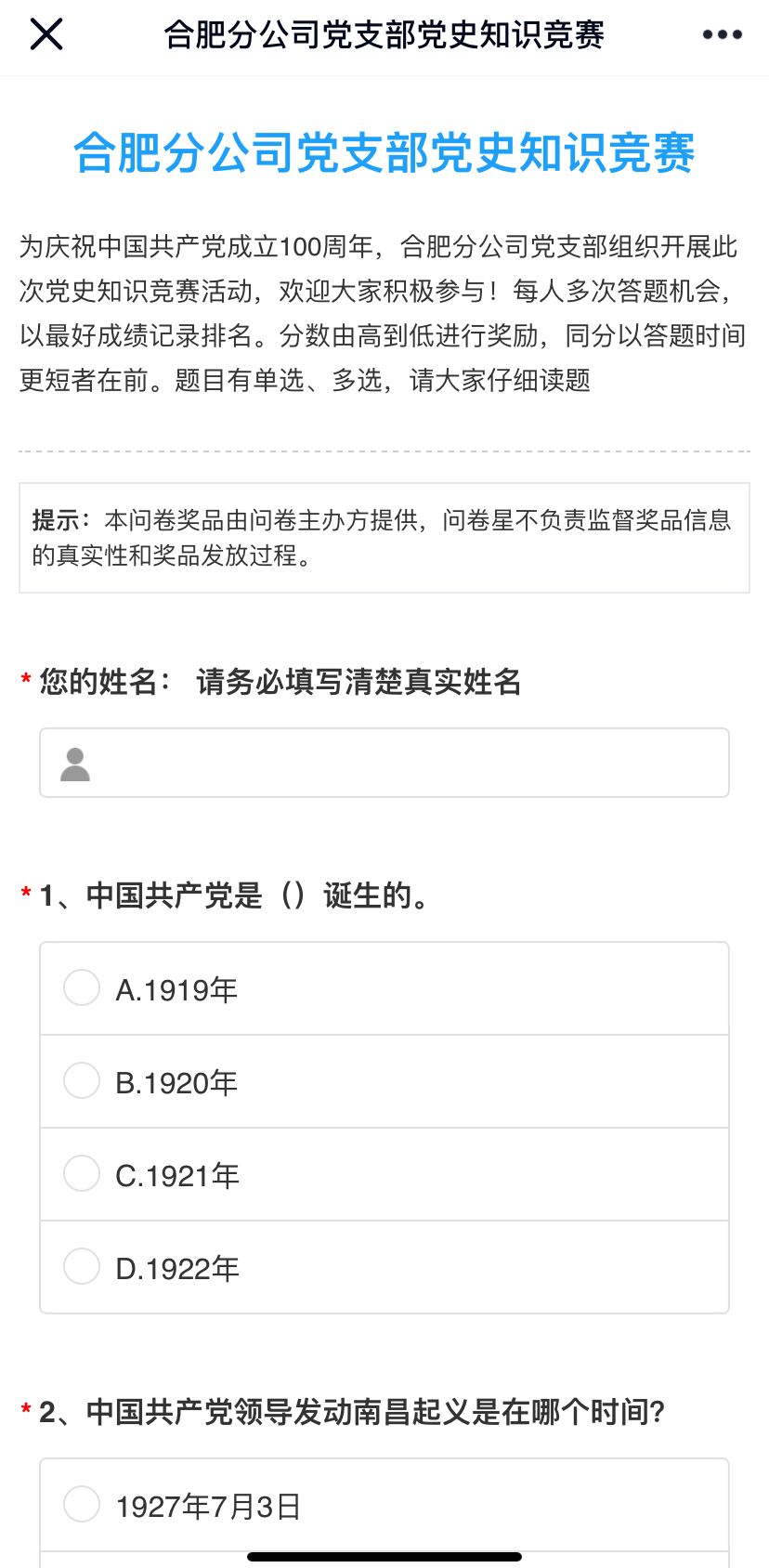 為慶祝中國共產黨成立100周年,持續推進黨史學習教育,引導分公司黨員干部學史明理、學史增信、學史崇德、學史力行,營造“知史愛黨、知史愛國”的良好氛圍,4月26日-27日,合肥分公司黨支部組織開展了黨史學習教育知識競賽活動。