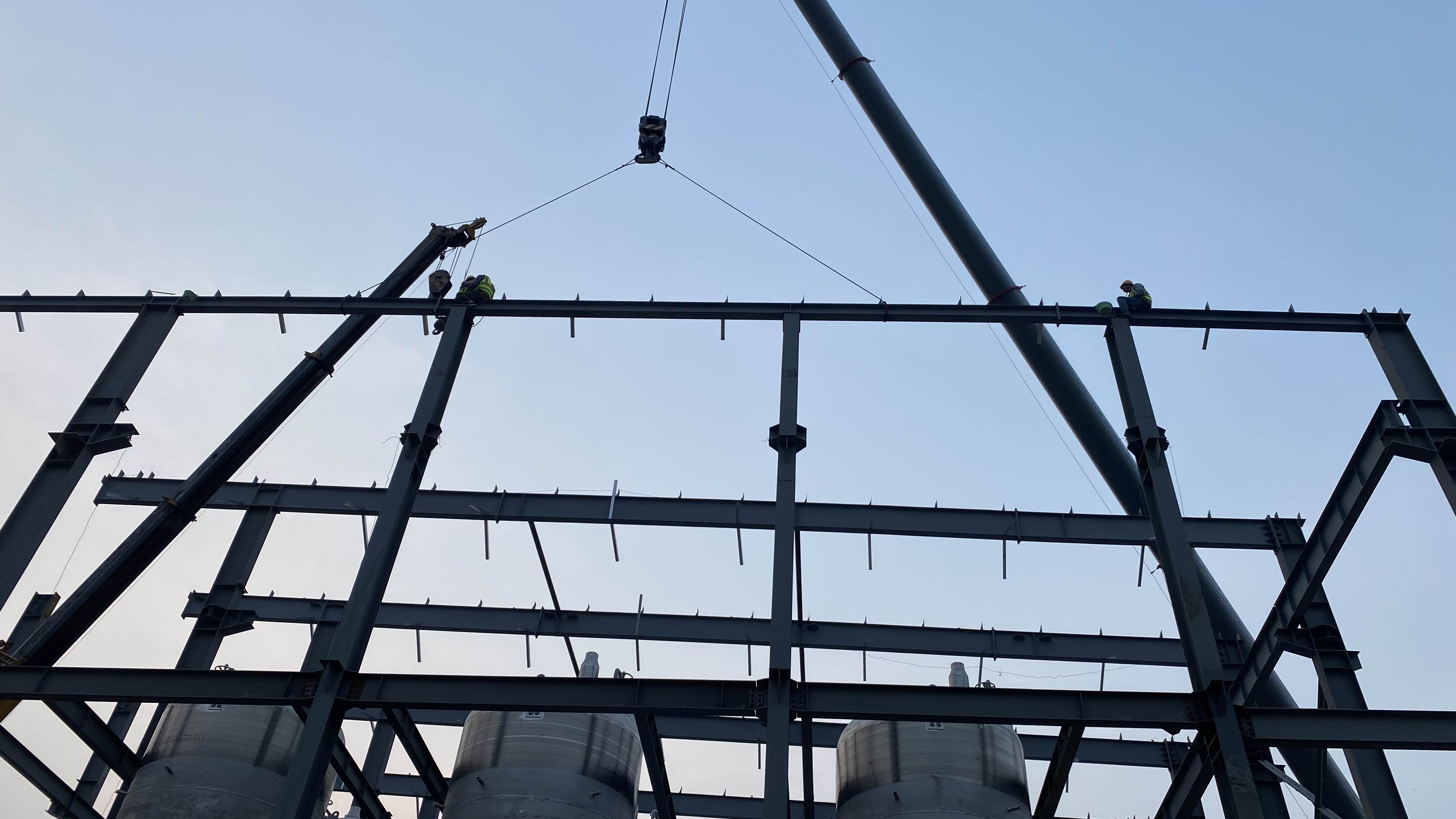 發酵車間吊車大臂高展,C區鋼結構工程鋼梁安裝正在進行,司索工鋼梁綁扎穩固后,現場信號工發出清晰信號,經驗豐富的司機操控著吊車將鋼梁緩緩升起,20米的高空上,兩名安全防護的工人等待著鋼梁靠近,停穩、就位、穩固、矯正、固定...一道道鋼梁就這樣架起,發酵車間的金屬骨架就這樣拔地而起,逐步形成。