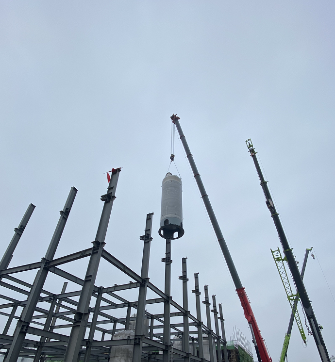 十余噸的罐體在吊車的牽引下緩緩升起,小心翼翼,精準前往指定基礎,施工人員進行固定矯正...30多臺工業用罐就這樣矗立起來。