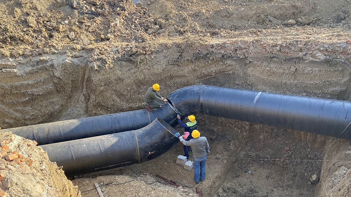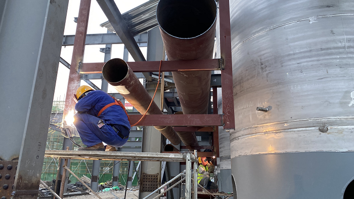 工藝管道班組也在忙忙碌碌,壓縮空氣管道在不斷架設,料場加工好的管道在吊車、葫蘆的牽引下就位,專業的焊工進行焊接,慢工出細活,保證每一道焊口符合規范要求,室外的循環水管也在與老廠的接口緊張對接。