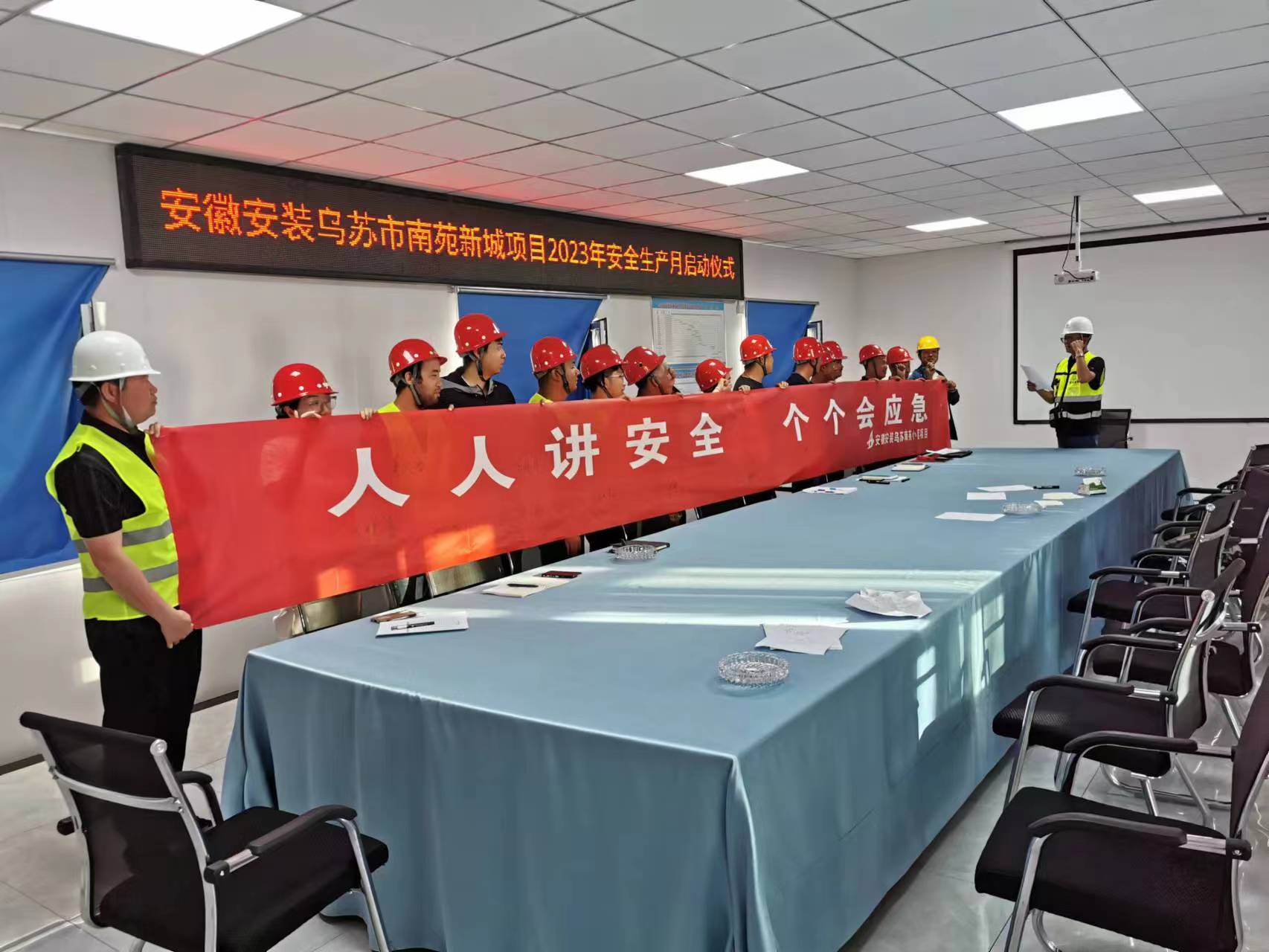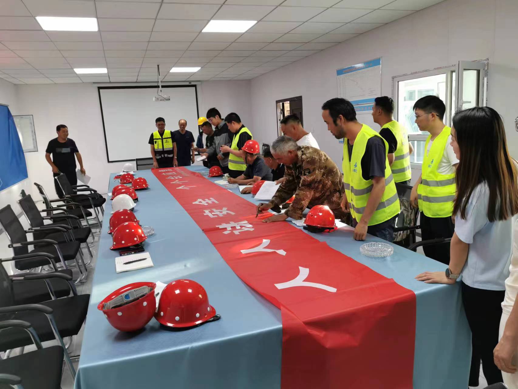 啟動儀式上,項目部安全員向大家宣讀此次安全月活動的活動方案,播放安全教育、警示類視頻,并著重講解施工現場及生活區一些常見而易忽視的安全隱患及防范措施,提升管理人員在面對風險時的安全意識,并指出確保安全是各類生產活動的首要任務,全員要樹立安全第一、生命至上的理念。分公司所屬項目部管理人員要嚴格落實安全生產責任制,樹牢安全紅線意識,通過宣傳教育、實戰演練、隱患排查等方式,讓分公司全體員工和所屬項目所有參建人員更積極主動參與到各項安全生產活動中來,清楚各自在安全體系管理中的責任及意義,努力營造一個“人人要安全、人人管安全”的良好安全管理氛圍,提升分公司安全管理水平。在儀式的最后,所有人員在安全員的帶領下莊嚴宣誓,并在印有“人人講安全,個個會應急”的橫幅上進行安全承諾簽名。