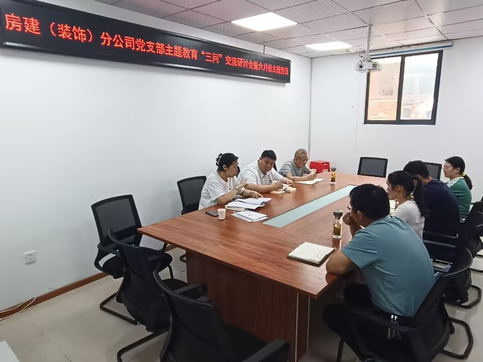 為深入學(xué)習(xí)貫徹習(xí)近平新時代中國特色社會主義思想主題教育,抓實支部理論學(xué)習(xí),努力在以學(xué)鑄魂、以學(xué)增智、以學(xué)正風、以學(xué)促干方面取得實效。6月16日下午,房建(裝飾)分公司黨支部在會議室組織召開主題教育“三問”交流研討會暨六月份主題黨日活動。會議由支部書記程茂麗主持,支部全體黨員參加。