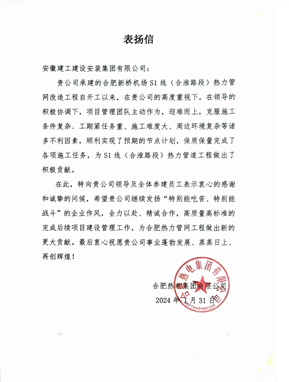 1月31日,合肥熱電集團有限公司發來表揚信,就建工安裝集團對合肥新橋機場S1線(合淮路段)熱力管網改造工程做出的積極貢獻予以充分肯定和真摯謝意。