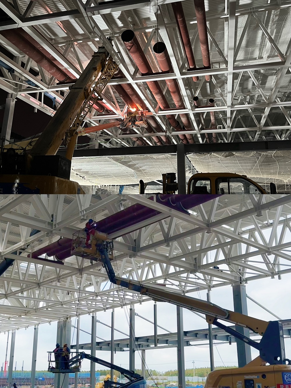 該項目本階段正在進行各車間直徑DN700、DN800的空調冷凍水管道吊裝搶工。為了能早日完成空調冷凍水管道吊裝的工程節點目標,項目管理人員以工期進度為主線,多次召開技術商討會,合理優化吊裝施工方案,全體員工實行24小時輪班工作制,夜晚輪流值班,晝夜奮戰、奮勇爭先,發起項目加速建設的“最強攻勢”。