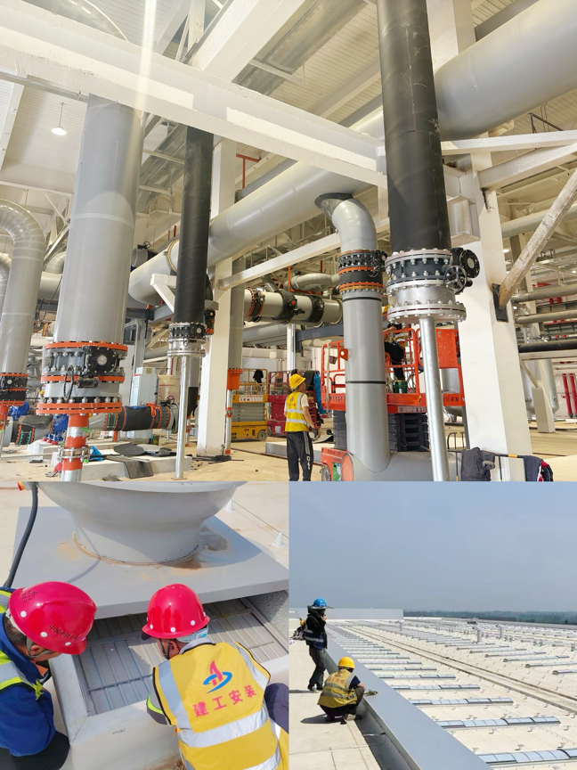 圖為新橋智能制造產業(yè)園項目部冷凍水管道保溫、屋面風機調試、TPO屋面防雷接地施工