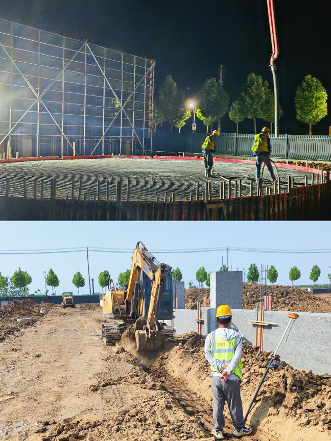 圖為明光科順涂料智能化生產基地項目筏板基礎混凝土澆筑、管道溝槽開挖