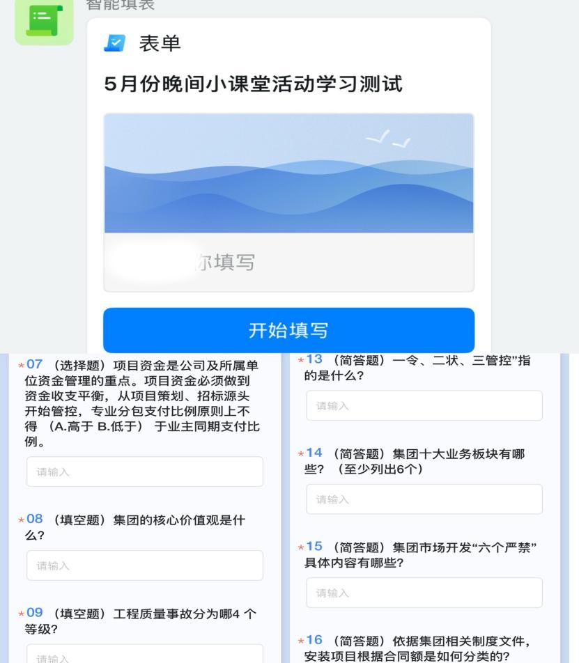 分公司黨支部依托“晚間小課堂”活動,建立“每周一課,每月一訓”長效學習機制,堅持“缺什么、補什么、學什么、用什么”原則,采用輪流授課、研討交流、觀看視頻、老員工傳授經驗等多種形式,重點學習集團公司和公司黨委相關制度文件以及《項目管理類文件選編》(2025版)等。通過活動,旨在進一步激發員工的學習內驅力,把學習成效轉化為提升合規意識和干事創業的具體行動。截至目前,第一輪學習已順利結束,全員在釘釘工作群內同步完成了“每月一測”考試答題。