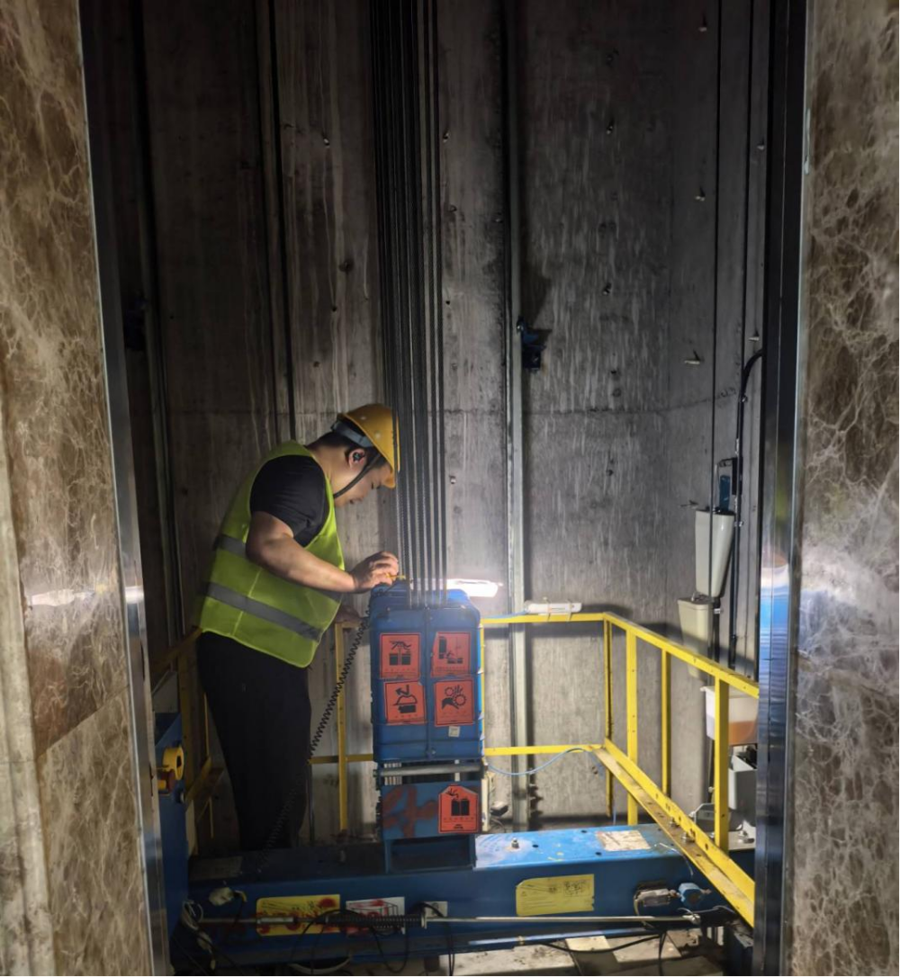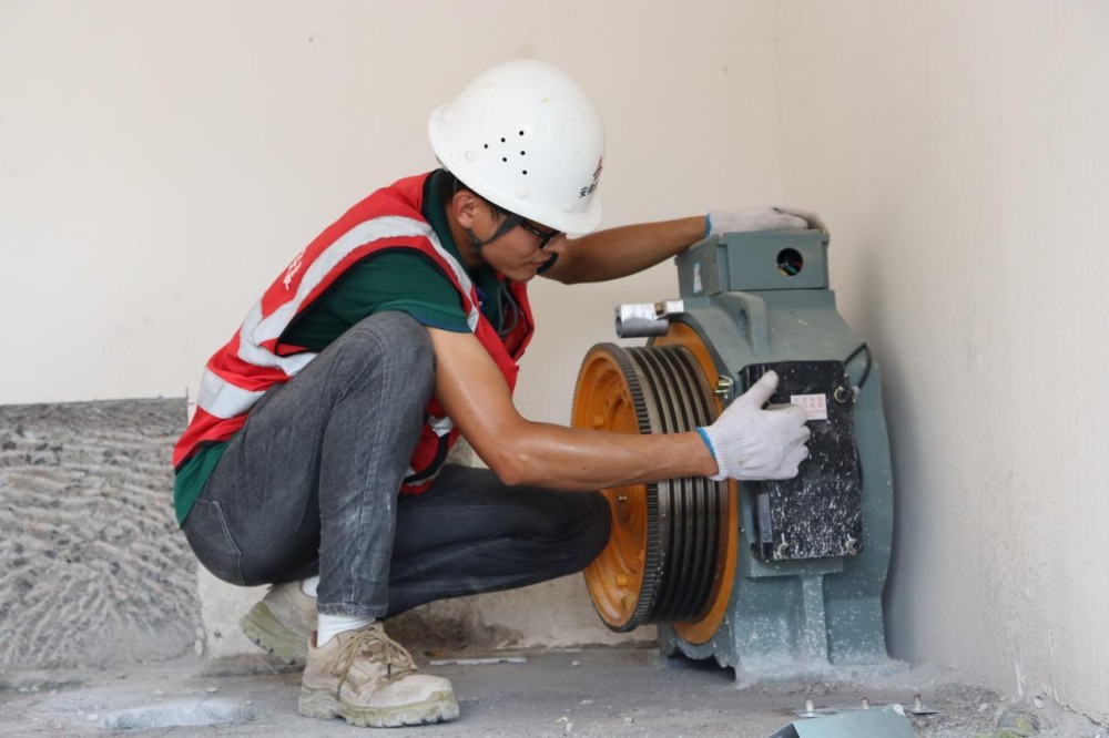 桃花科創產業園EPC項目施工人員正在調試電梯主機平衡度
