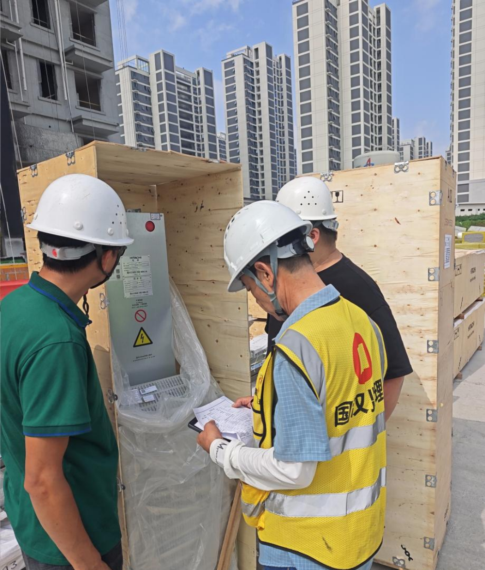 長豐縣雙墩鎮紫桐苑項目項目管理人員正在對電梯開箱核對數據參數