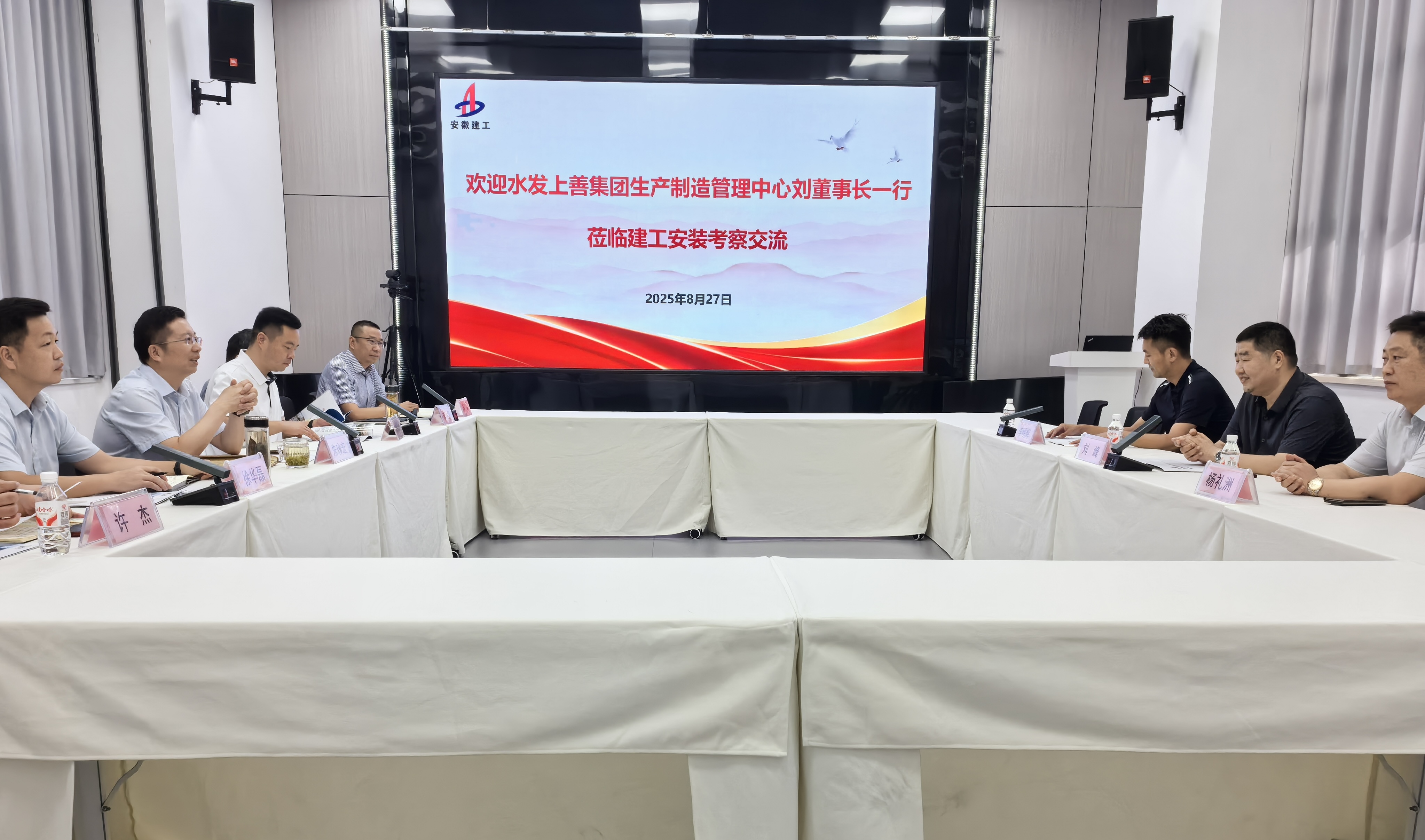 8月27日上午,山東水發上善集團生產制造管理中心董事長劉峰一行到訪建工安裝。建工安裝黨委書記、董事長朱珍宏熱情接待并進行工作會談。